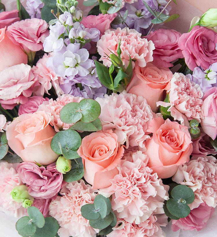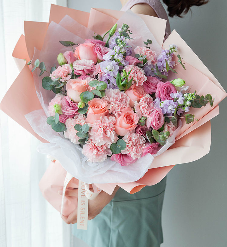 - 花材:粉色康乃馨13枝,戴安娜玫瑰5枝、3头或以上粉色洋桔梗5枝、浅紫紫罗兰5枝(紫罗兰花期为12-4月,其他月份用浅紫色金鱼草/浅紫色桔梗/浅紫色风铃花等相似线状花材替代)、尤加利10枝