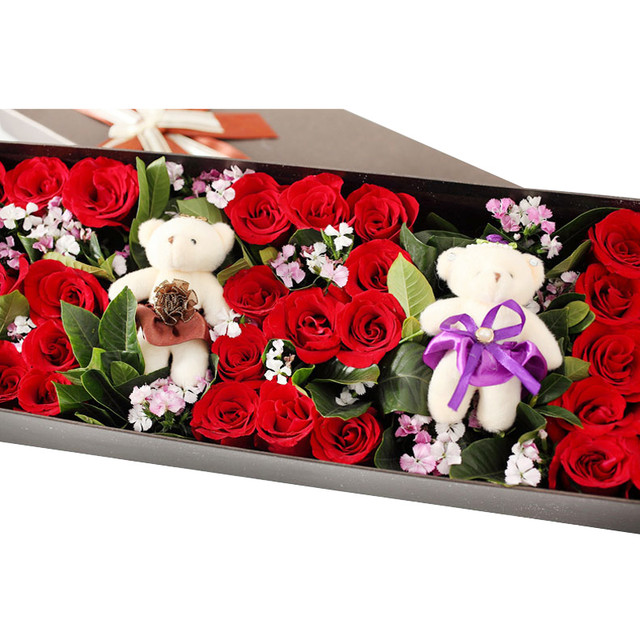 33朵红玫瑰,栀子叶、石竹梅搭配,小熊一对