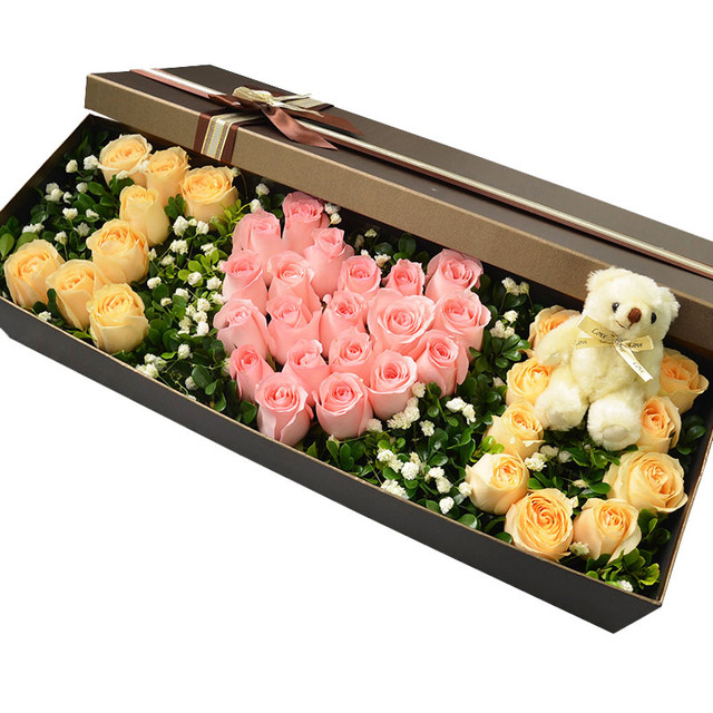 36朵玫瑰(香槟+粉),绿叶、满天星,小熊