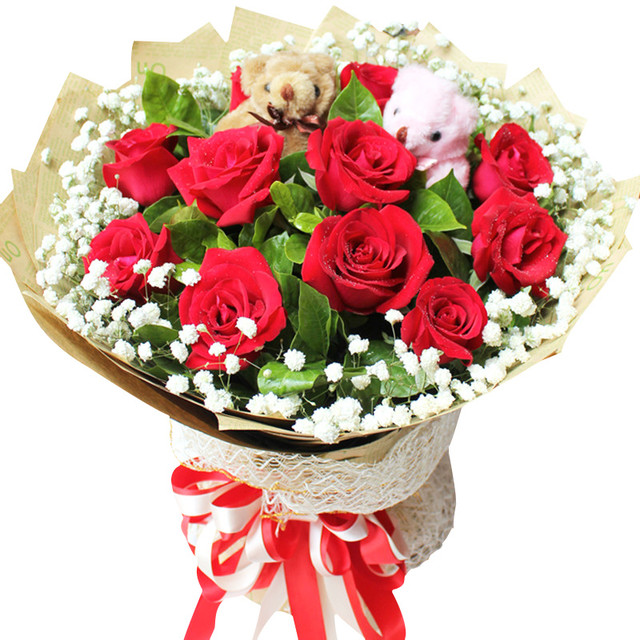 11枝红玫瑰,栀子叶、满天星,一对小熊