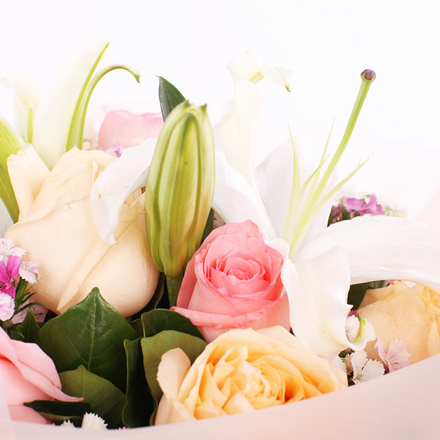 11枝混搭玫瑰(香槟、戴安娜)2枝白百合,相思梅、栀子叶