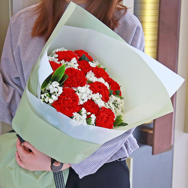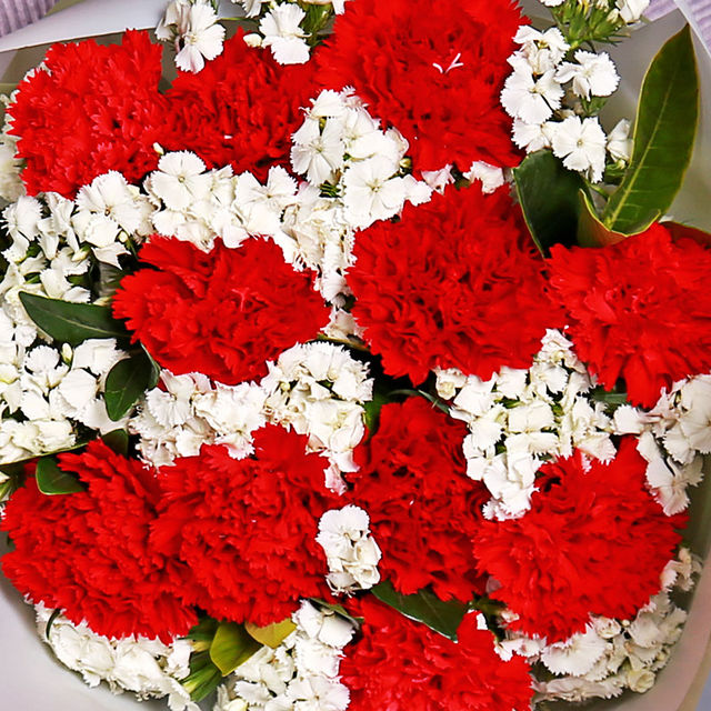 11枝红色康乃馨,白色相思梅,栀子叶