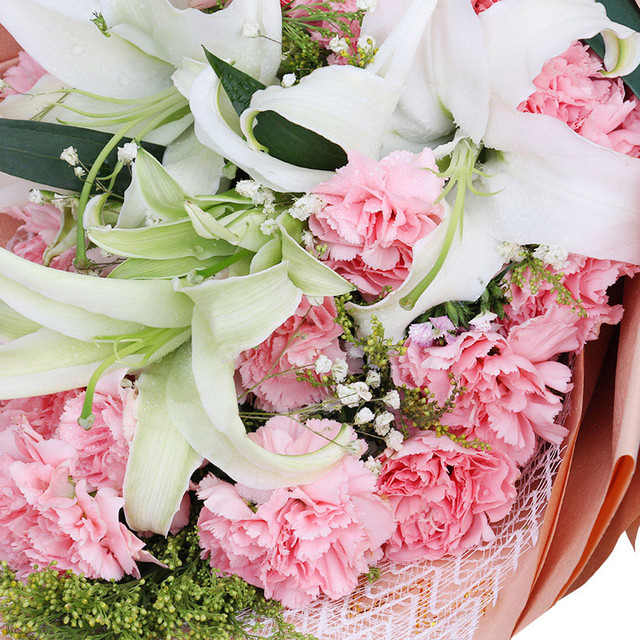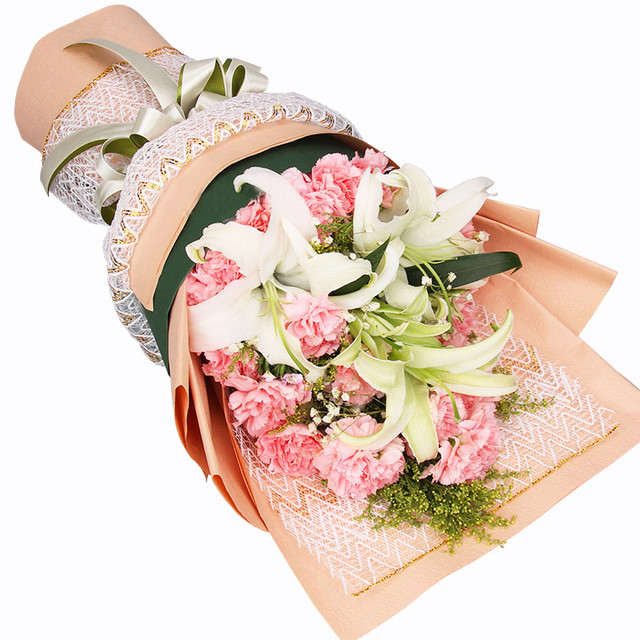19朵粉色康乃馨,2枝香水百合,满天星、黄莺