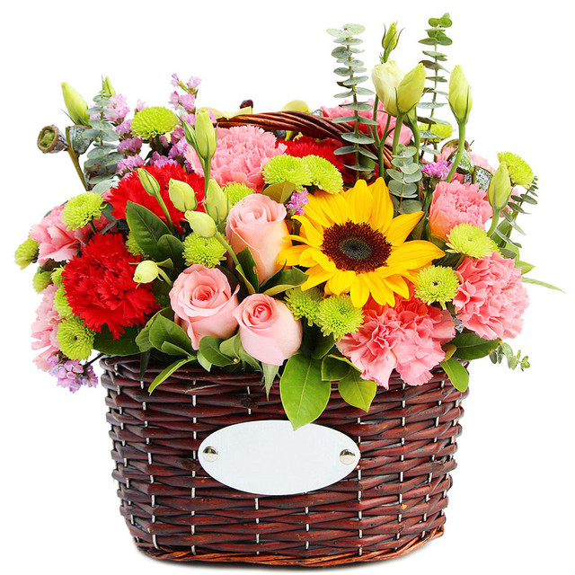 6枝粉玫瑰,13枝康乃馨,1朵向日葵,搭配桔梗、尤加利叶、小雏菊、栀子叶