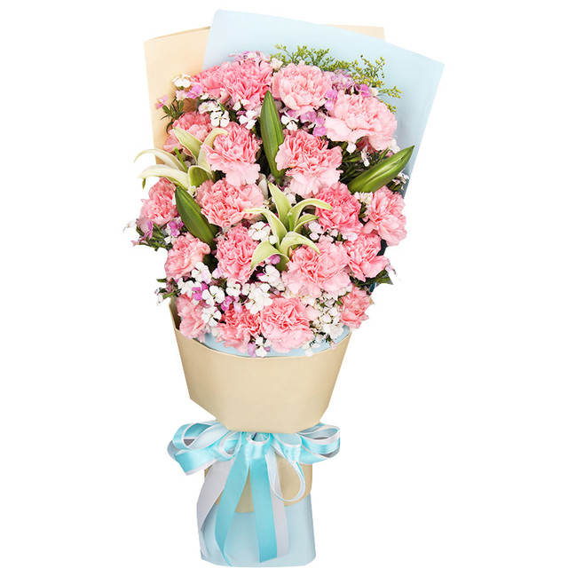 19朵粉色康乃馨,两支香水百合,相思梅、黄莺
