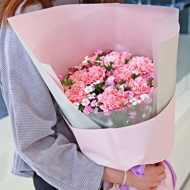 白色条纹雾面纸内衬、粉色双面纸外包,精美蝴蝶结