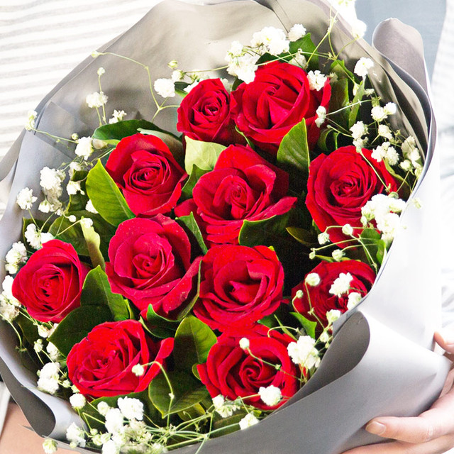 11枝红玫瑰,满天星、栀子叶