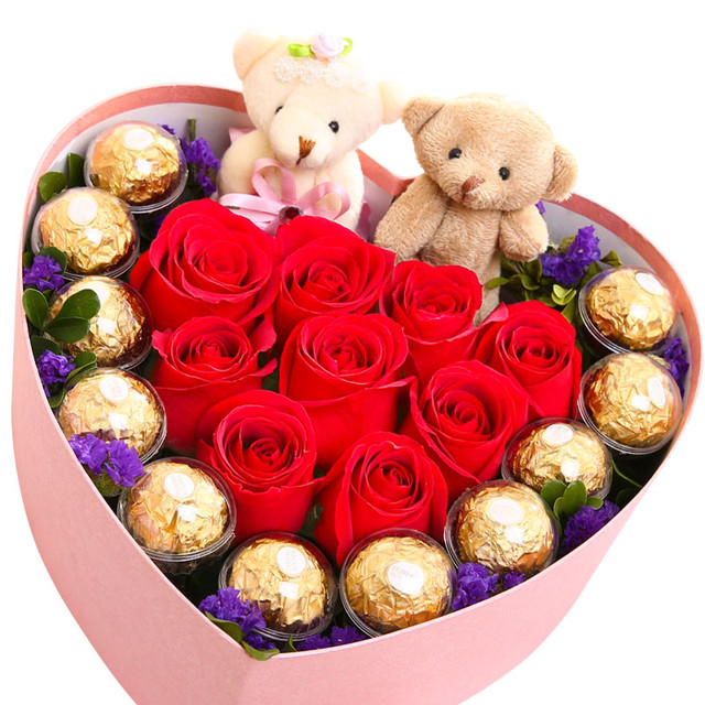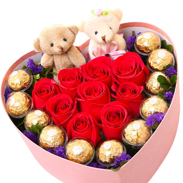 9朵红玫瑰,11颗巧克力,一对小熊,勿忘我