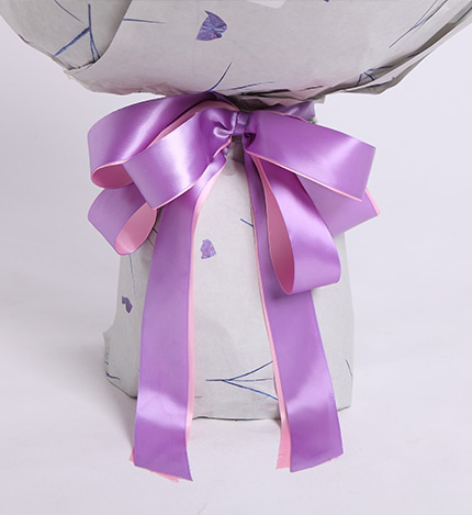 内层粉色厚棉纸 外层银灰色短平板印花树叶草 粉紫双色缎带