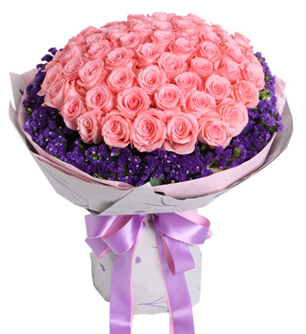 戴安娜粉玫瑰66枝,紫色勿忘我1扎