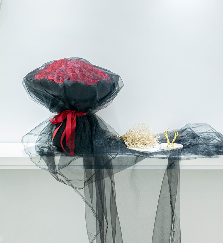 黑色条纹纸4张,黑色雪梨纸4张.黑纱4米,红色缎带4米