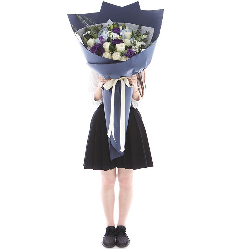 - 花材:雪山白玫瑰19枝、蓝绣球3枝、紫色桔梗5枝、白色石竹梅7枝、栀子叶10枝、尤加利5枝,花束长达1.2m~1.3m