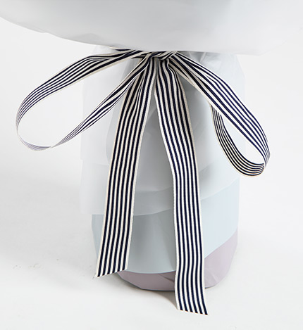 内层香芋人造双面纸,灰蓝绝色纸,外层白色opp雾面纸,白蓝细条纹缎带