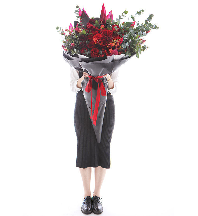 - 花材:卡罗拉红玫瑰33枝、红色朱蕉叶3枝、千代兰7枝、大红色多头玫1.5扎、尤加利叶1扎,花束长达1.2m~1.3m
