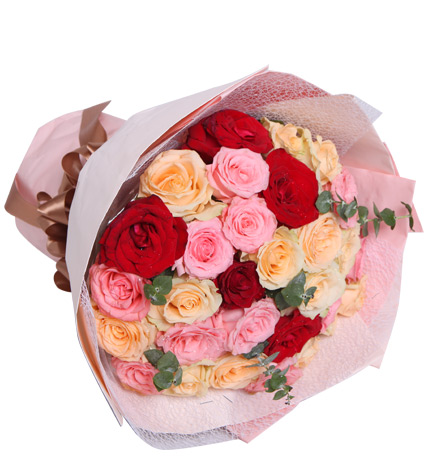 - 花材:33朵玫瑰混搭:戴安娜粉玫瑰15枝,香槟玫瑰13枝,红玫瑰5枝,搭配适量绿叶
