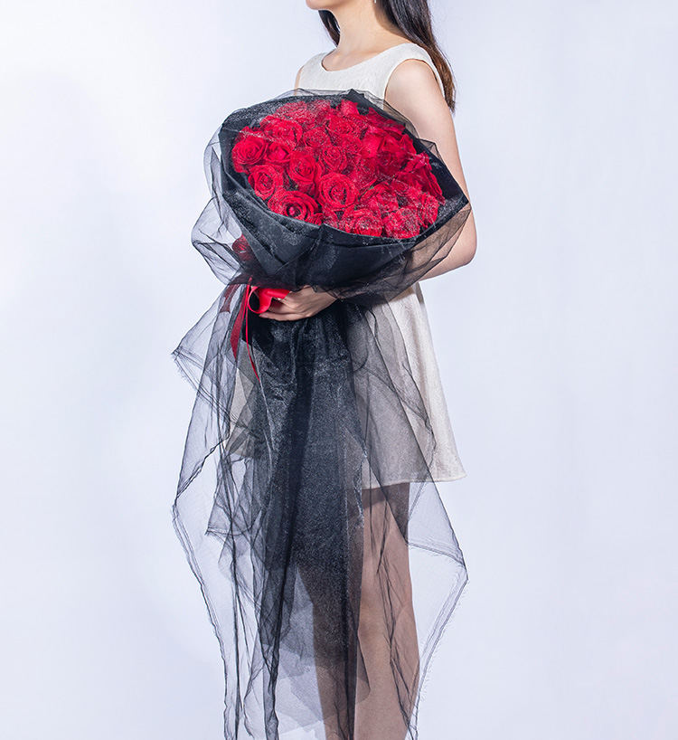 黑色条纹纸3张,黑色雪梨纸2张.黑纱2米,红色缎带2米