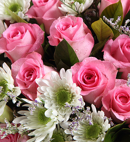 苏醒玫瑰19枝,粉色桔梗2枝,白色小菊4枝,情人草5枝,栀子叶5枝