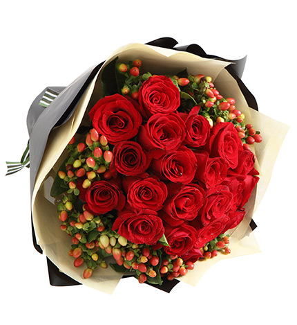红玫瑰19枝,红豆10枝(如当地红豆缺货,用相思梅等其他寓意相近配材替代。)