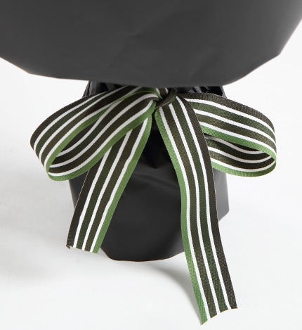 内层黄色不织布,外层黑色opp雾面纸,白绿粗罗纹带