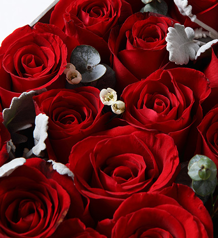 红玫瑰39枝,搭配白色腊梅、尤加利、银叶菊少量