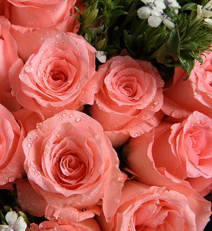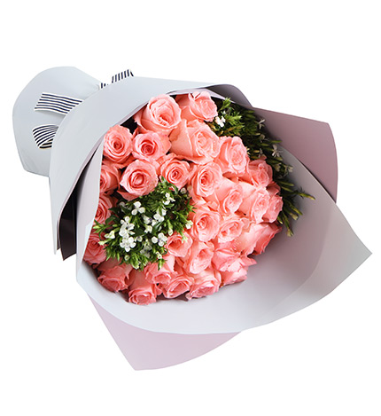 戴安娜粉玫瑰33枝,白色相思梅5枝