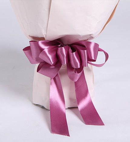 内层深咖啡平面牛油纸,外层浅粉色短平板,紫色缎带花结