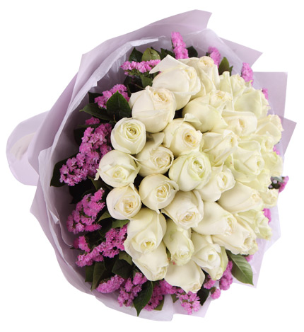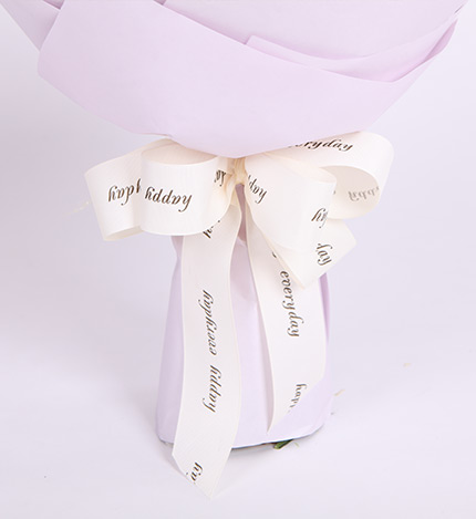 内层白色棉纸,外层浅紫色白牛皮纸,米白色螺纹缎带花结