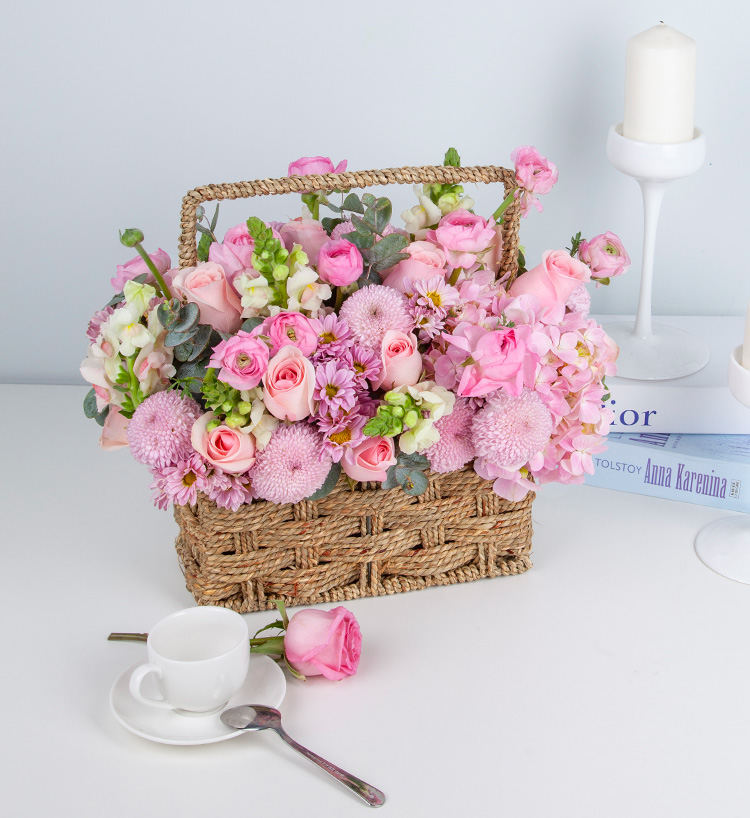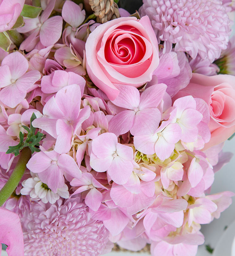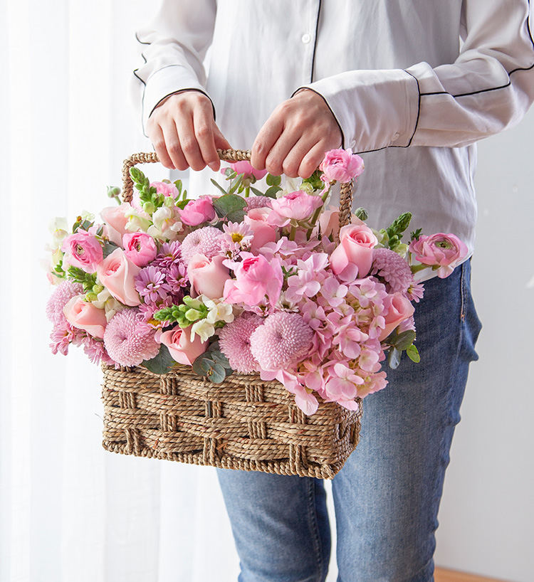 - 花材:粉佳人玫瑰10枝,粉色洋牡丹10枝(洋牡丹的花期为12-4月,其他季节用粉色多头玫瑰代替),粉色绣球1枝,粉金鱼草10枝,粉乒乓菊10枝,粉多头小菊5枝,尤加利叶10枝