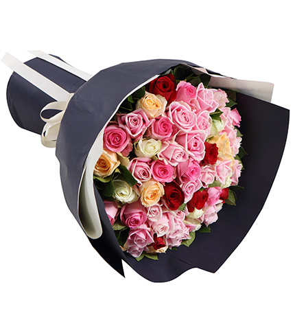 - 花材:各色玫瑰共50枝:粉玫瑰32枝(戴安娜粉玫瑰或玛利亚粉玫瑰),白玫瑰6枝,香槟玫瑰6枝,红玫瑰6枝,栀子叶10枝