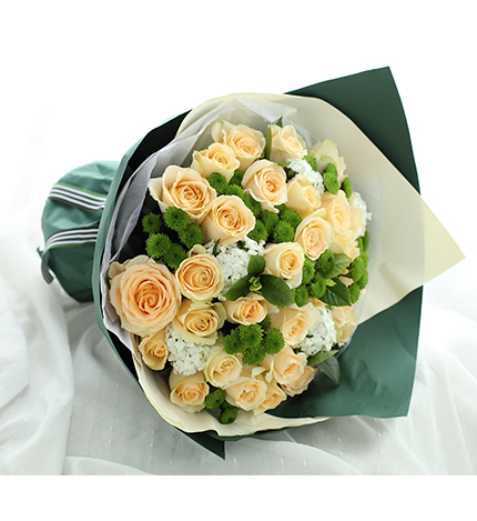 - 花材:香槟玫瑰33枝、绿色小雏菊8枝、白色石竹梅5枝、栀子叶3枝