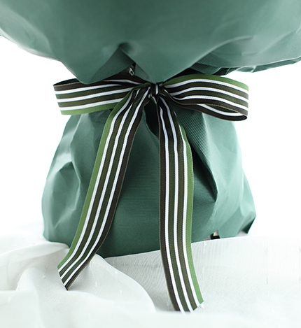 - 包装:白色雪梨纸1张、米白色平面纸1张、墨绿色条纹纸1.5张、白绿粗条纹罗文带1米