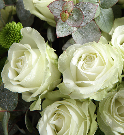 雪山白玫瑰33支、尤加利叶8支、绿小菊10支