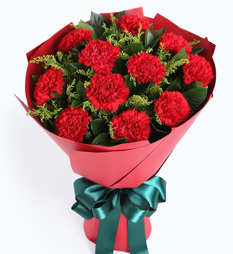 红色康乃馨11枝,黄莺10枝,栀子叶8枝