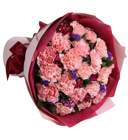 粉色康乃馨19枝,石竹梅10枝、紫色勿忘我0.2扎、栀子叶10枝
