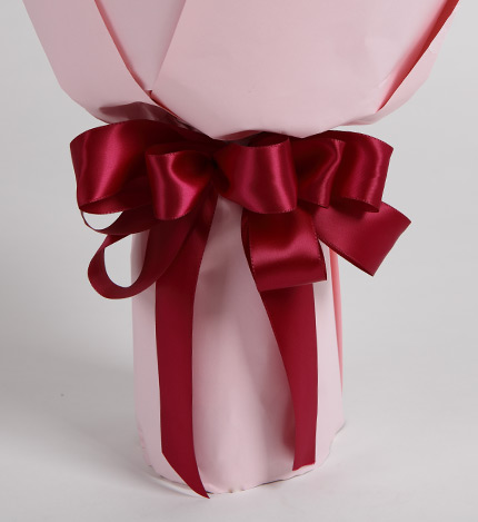 内层紫红色不织布,外层粉色白牛皮纸,玫红色缎带花结
