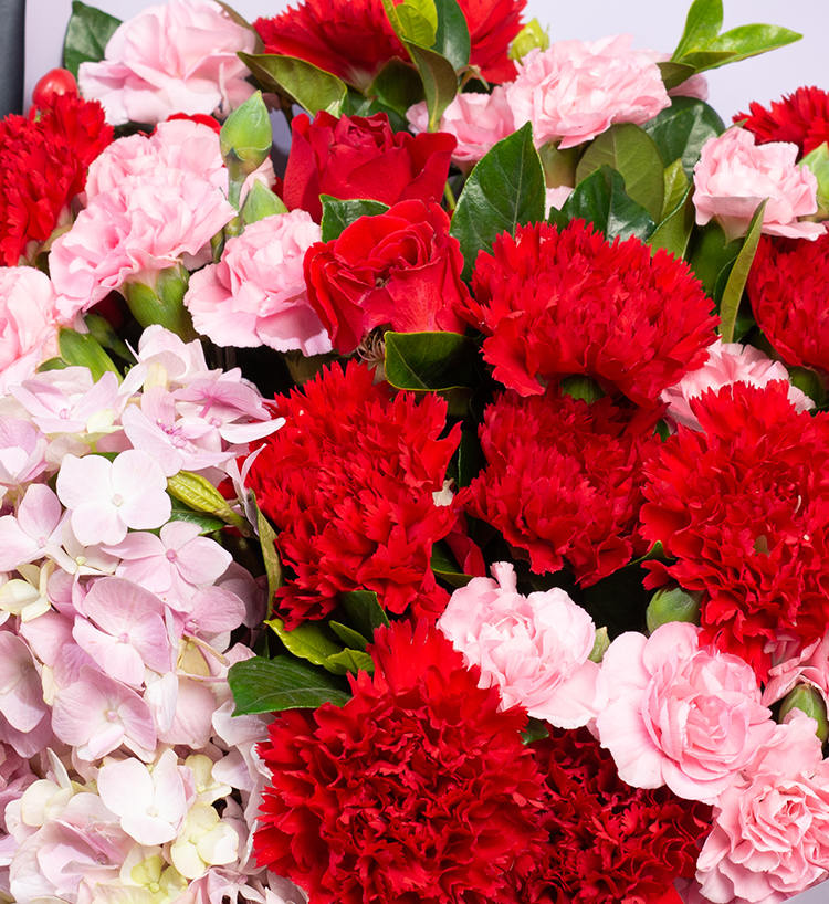 - 花材:红康乃馨10枝,粉色绣球1枝,红色多头玫瑰3枝,粉多头康乃馨5枝,栀子叶10枝,红豆10枝