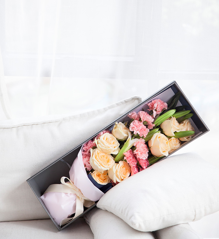 - 花材:香槟玫瑰9枝、多头白百合2枝、粉色康乃馨13枝