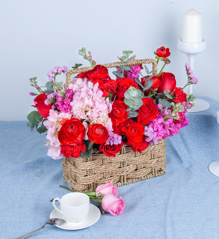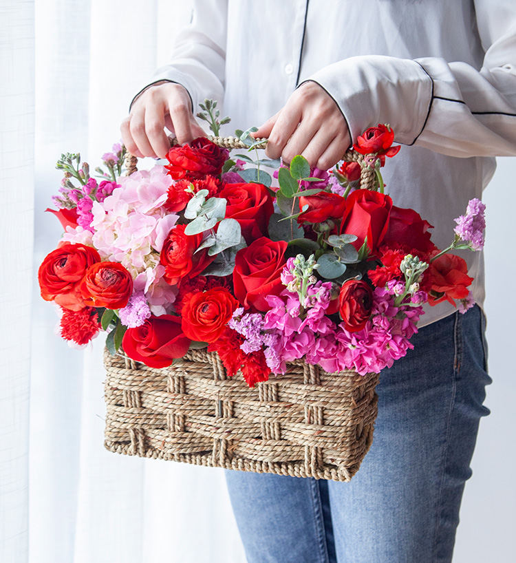- 花材:红康乃馨10枝,红玫瑰10枝,红色洋牡丹10枝(洋牡丹花期为12-4月,其他季节用红色多头玫瑰代替),粉色绣球1枝,紫红紫罗兰10枝(紫罗兰花期为3-6月,其他月份用紫红金鱼草或红色剑兰等相似线条状花材替代),粉勿忘我10枝,尤加利叶10枝