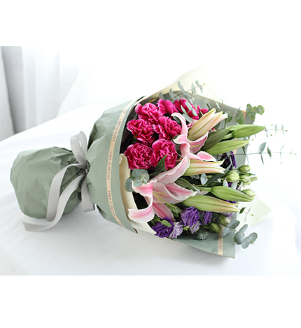 紫红色康乃馨9枝,粉色多头香水百合2枝,紫色桔梗4枝,尤加利叶10枝