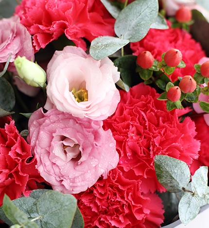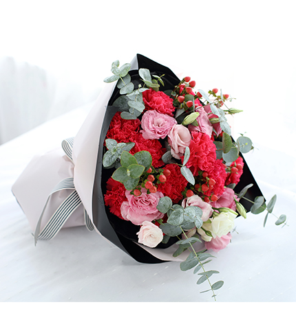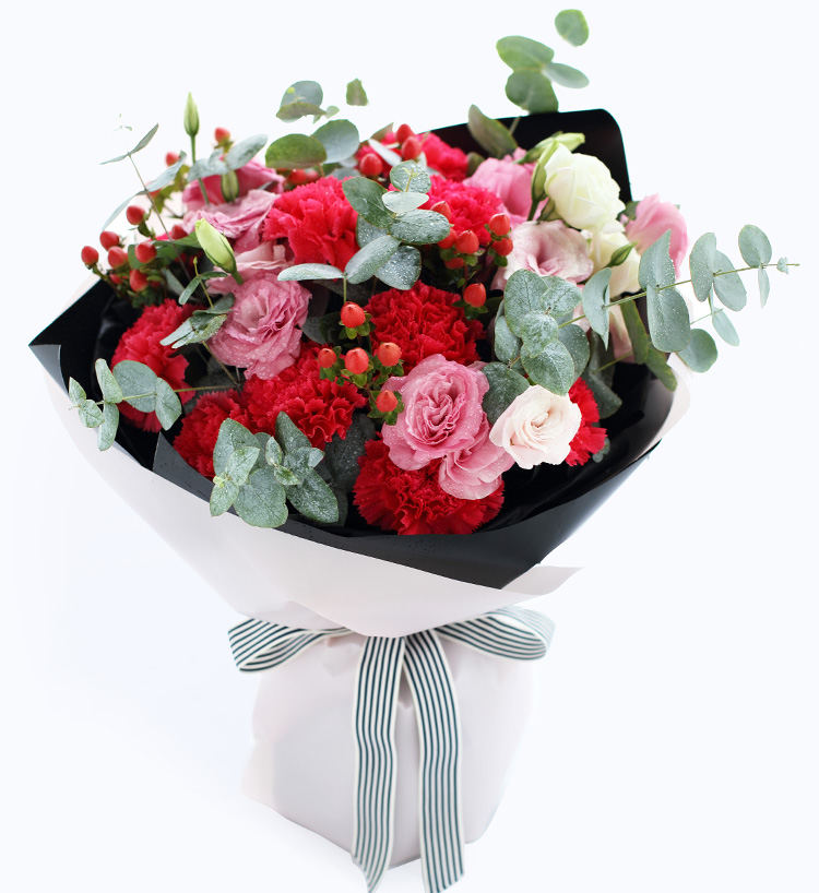 - 花材:红色康乃馨11枝,粉色桔梗4枝,红豆5枝,尤加利10枝(如当地红豆缺货,用相思梅等其他寓意相近配材替代。)