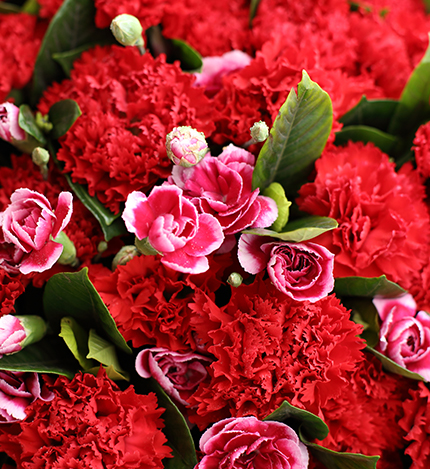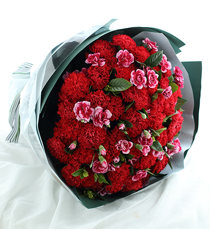 - 花材:红色康乃馨66枝,搭配白边紫色多头康乃馨15枝,栀子叶2扎