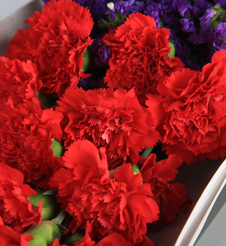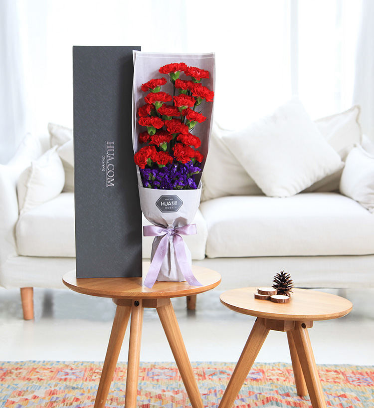 高档礼盒装鲜花:红色康乃馨19枝,勿忘我0.3扎