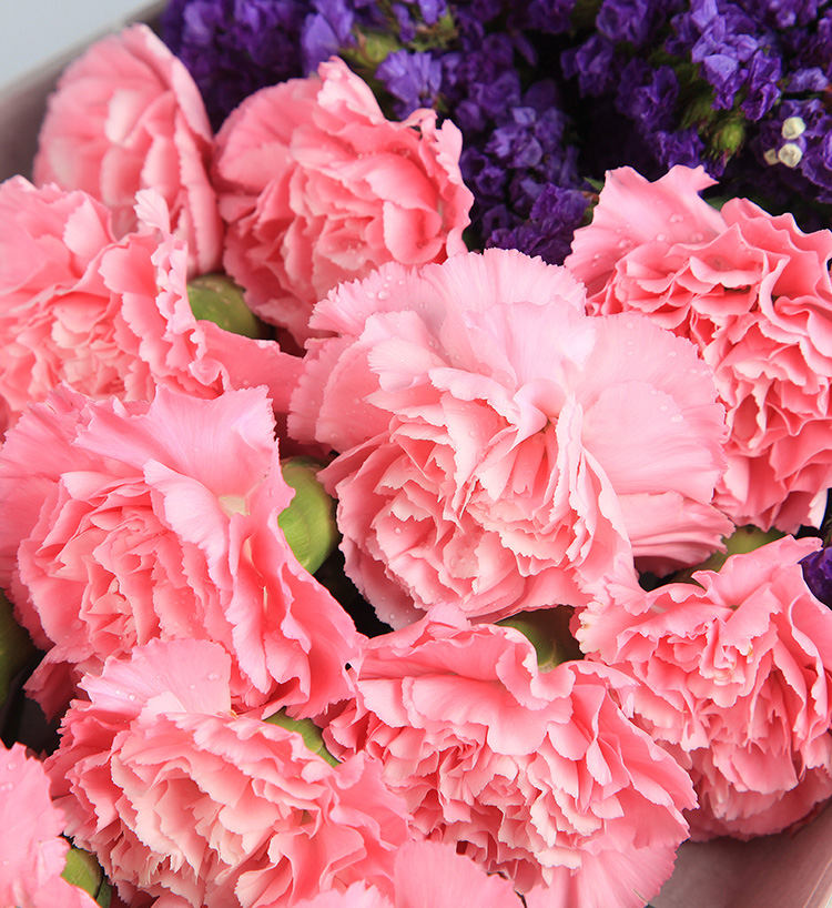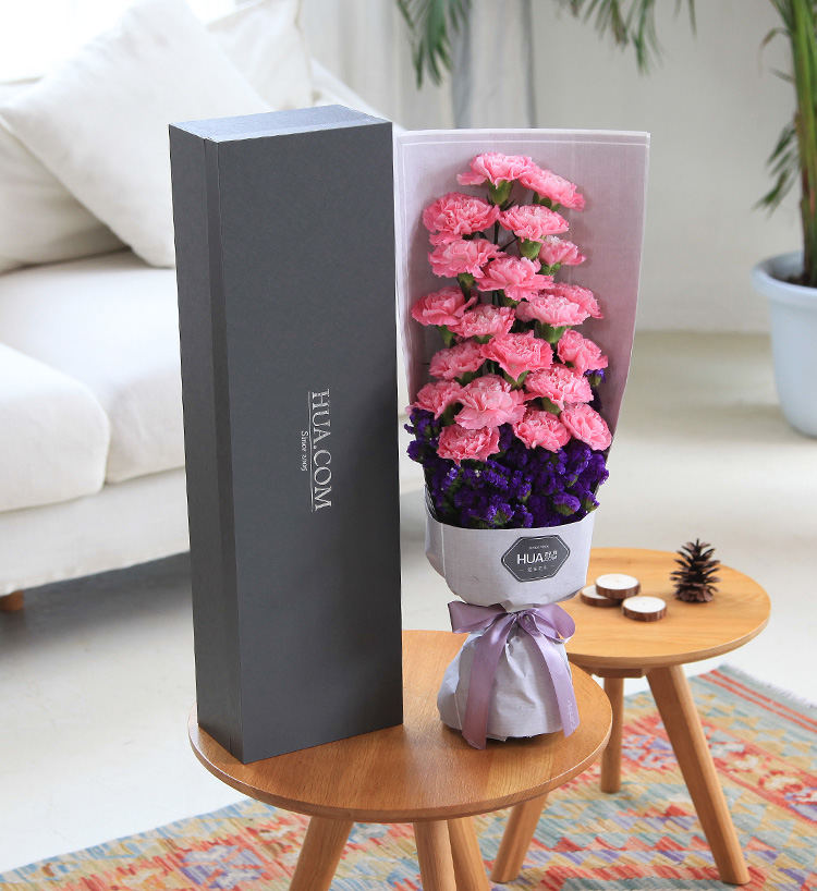 高档礼盒装鲜花: 粉色康乃馨19枝,勿忘我0.3扎