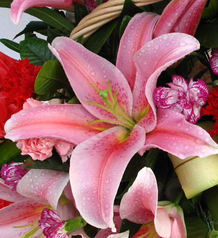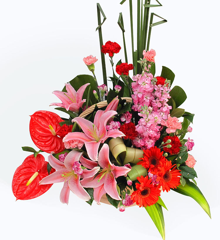 - 花材:红掌2枝,多头粉香水百合2枝(5朵),红太阳花3枝,红康乃馨5枝,粉康乃馨5枝,紫罗兰3枝(紫罗兰花期为3-6月,其他月份用粉色金鱼草或者粉色剑兰代替),巴西叶2片,水蜡烛叶10枝,龟背叶2片,栀子叶5枝