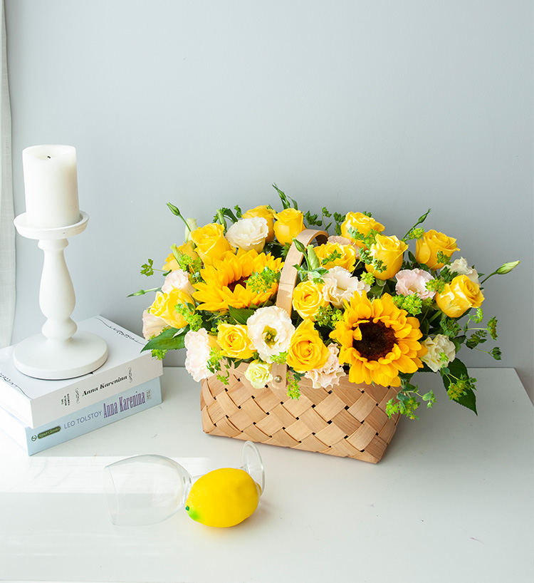 向日葵2枝,金枝玉叶玫瑰13枝,香槟桔梗0.2扎,叶上黄金0.2扎