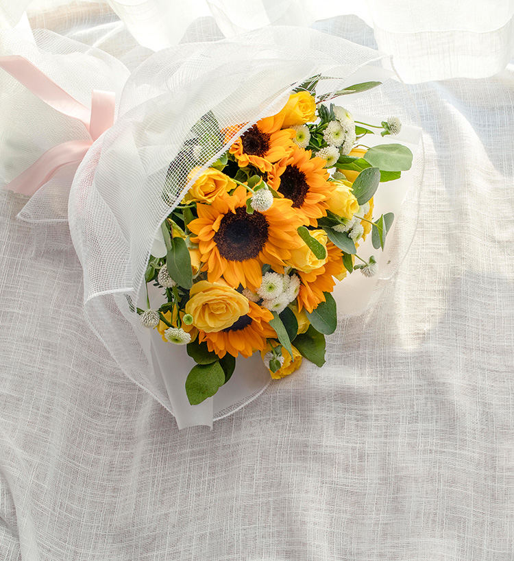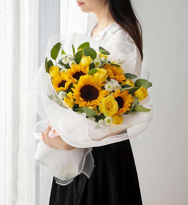 - 花材:向日葵5枝,多头金香玉玫瑰6枝,白色小雏菊3枝,千日白0.1扎,进口圆尤加利叶3枝