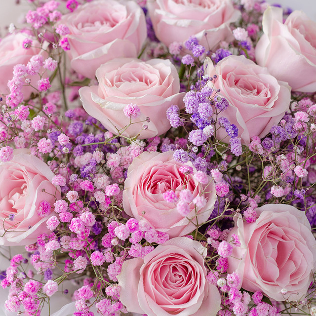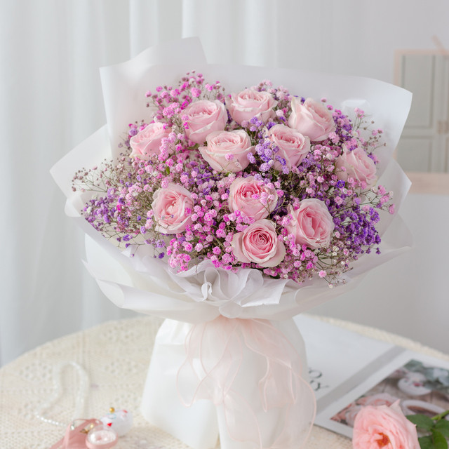 11枝粉雪山玫瑰搭配粉色满天星、紫色满天星