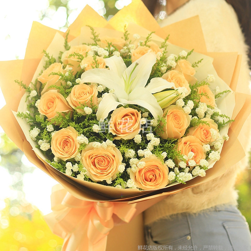 1、鲜花为手工制作,实际花束可能会与图示有些出入,但我们保证鲜花主花材品种、新鲜程度、数量、颜色与说明一致。