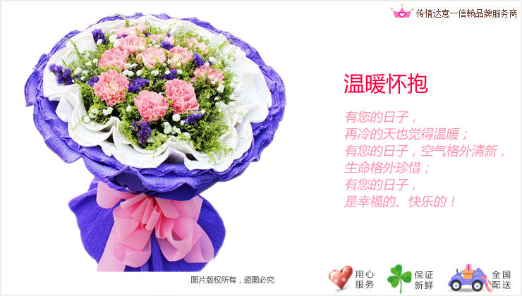 1、鲜花为手工制作,实际花束可能会与图示有些出入,但我们保证鲜花主花材品种、新鲜程度、数量、颜色与说明一致。