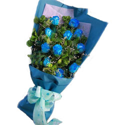 【花材】:11枝顶级蓝玫瑰,情人草、绿叶点缀